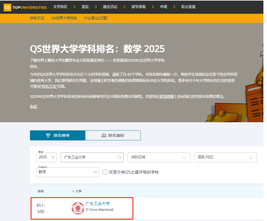 Mathematics Discipline of GDUT ranked in the 451-500 of the QS