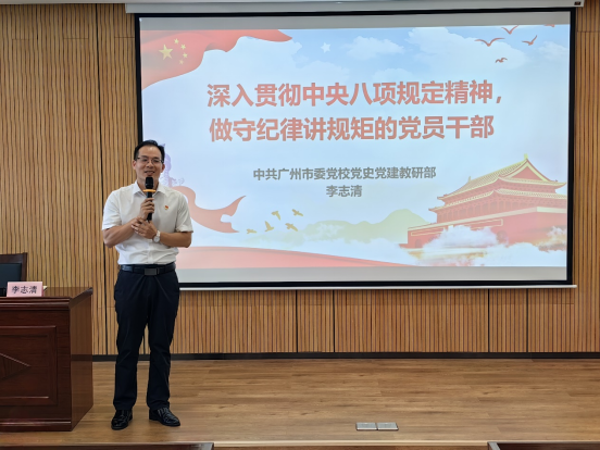 为扎实开展深入贯彻中央八项规定精神学习教育,切实推进作风建设常态化长效化,5月13日下午,我院在龙洞校区图书馆7楼多功能报告厅召开深入贯彻中央八项规定精神学习教育专题辅导报告会,特邀广州市委党校李志清副教授作专题辅导报告。我院领导班子成员、全体师生党员参加报告会。会议由我院党委副书记林逢春主持。