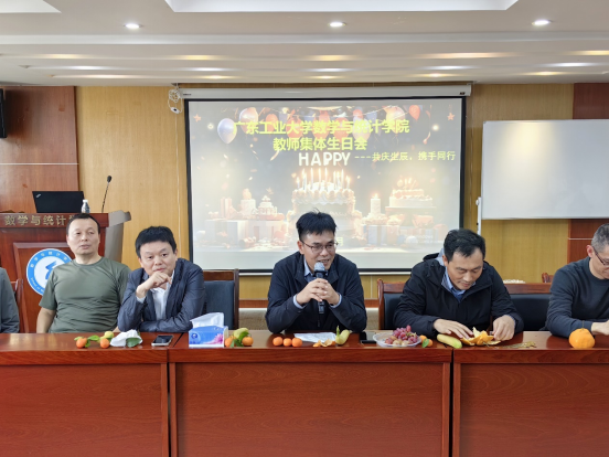 生日会在轻松愉悦的生日歌中拉开帷幕。李锋老师代表学院工会,向参与生日会的各位寿星老师们致以最诚挚、最热烈的生日祝福!祝每位老师岁岁欢愉,万事胜意,学术之路繁花似锦,生活之中温馨常伴。学院党委书记林良盛对老师们为学院发展和人才培养所付出的努力和贡献表示感谢,并强调教师是学院最宝贵的财富,学院将持续关注教师的工作与生活,竭力为大家创造更好的条件。学院院长陈智奇则希望大家在新的一岁里,不仅在学术上勇攀高峰,生活中也能收获更多小确幸,“数学公式不烧脑,生活难题轻松化解没烦恼”。