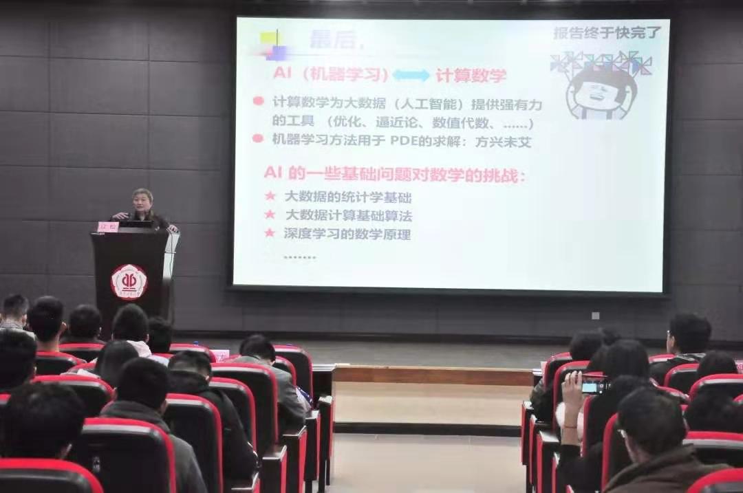 最后,他指出偏微分方程和计算数学亟待解决的问题很多,是大有可为的领域。报告内容丰富、深入浅出,有深度有广度,蕴含着精妙的数学科学思维,生动有趣,赢得了广大师生的阵阵掌声。