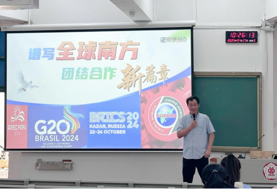 陈智奇院长则以《谱写全球南方团结合作新篇章》为题,从全球南方国家为抓手讲解如今的国际形势,再到中国以“三大倡议”合力构建人类命运共同体:全球发展倡议、全球安全倡议和全球文明倡议。他带领同学们共同见证了中国在以推进全球发展倡议合作、携手共建“一带一路”、创设“全球发展和南南合作基金”等实实在在的合作成果促进全球南方国家的共同繁荣。他鼓励同学们在学好专业基础知识的同时,更要关注国际形势与国家发展战略,淬炼过硬本领,将个人成长融入民族复兴的伟大征程。