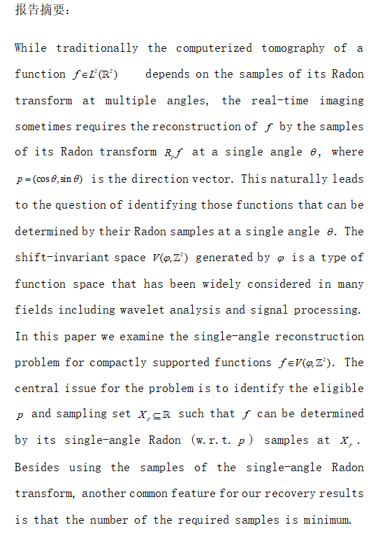 报告题目:Determination of compactly supported functions in shift-invariant space by single-angle Radon samples