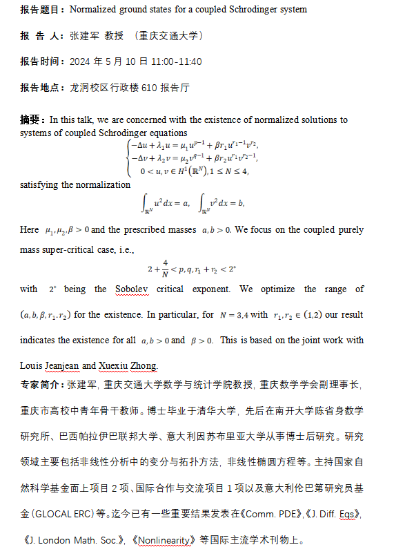 数苑讲坛2024(十六):Normalized ground states for a coupled Schrodinger system