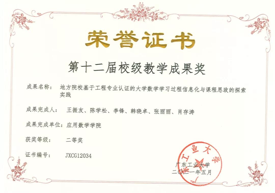 学院获得广东工业大学第十二届校级本科教学成果二等奖2项,研究生教学成果奖二等奖1项。