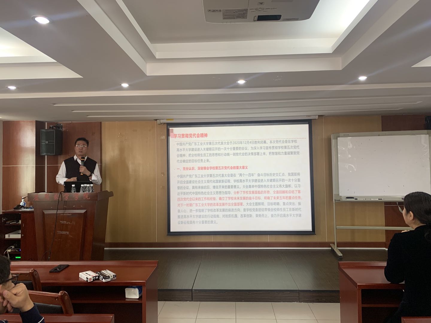 为深入学习贯彻学校第五次党代会精神,将学院教师的思想和行动统一到党代会的决策部署中。2020年12月29日下午,我院在龙洞校区行政楼610召开了全院教职工大会,集体学习学校第五次党代会精神。学院党委书记林伟英主持了本次会议。