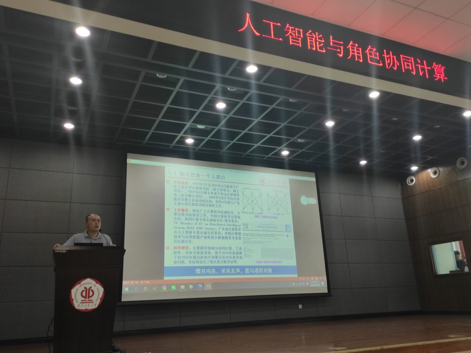 随后,计算机学院副院长刘冬宁教授为学生带来题为《人工智能与角色协调计算》的专题讲座。刘教授结合自身“如人饮水”执着求学的经历,向同学们展现了他热爱数学的初心和追梦圆梦的奋斗历程,回溯“时间简史”刻画出计算机发展沿革生及相关名家学人在推动计算科学发展的重大贡献与启发,重点向同学们剖析了人工智能应用以及“角色协同”计算相关知识,从中阐释了数学在现代科技发展中的重要性及其与计算机人工智能之间密切的联系,立足方兴未艾的人工智能发展浪潮阐明了数学学科的发展面向,启发同学们学习数学应“路往何方”。同时,他还以“是飞鸟,就有对天空的向往”及“书山有路,路在何方”表达了其对全体数学学子求知奋进的殷切期望。
