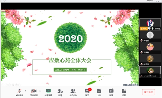 首先,心协会长骆华梅同学回顾总结了上学期及近期各部门的工作情况,并交流了学生群体中面对疫情产生的各种心理健康等方面问题。随后,各部门部长依次对近期公众号推文工作和接下来开展的心理电影、居家心理云指导、网课进行时精彩花絮等活动进行说明及工作布置,并强调居家抗疫时期,各位同学对时间进行合理的规划,注意劳逸结合工作。最后,乔老师对疫情特殊时期大家的工作表示充分的肯定,对心协成员在心苑大家庭中的成长感到欣慰。在过去一段时间,大家积极展开线上活动,助力师生心理调适及疏导。同时乔老师对新学期提出工作展望,特别传达了学校关于疫情防控的工作安排,向同学们讲解了学校疫情防控的具体要求。在疫情期间,更是要转变思维方式继续积极服务同学,认真做好心理健康工作,把心苑的温暖传递给身边每一位同学。