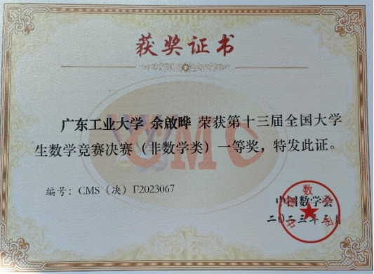 第十三届全国大学生数学竞赛决赛于2023年3月25日在华东师范大学举行,我校在本次比赛取得历史性突破,斩获全国一等奖1项、全国三等奖1项。我校余啟晔同学(20级机电工程学院机械设计制造及其自动化专业)荣获非数学类全国一等奖,吴英俊同学(18级自动化学院自动化专业)荣获非数学类全国三等奖,这是我校首次获得该项竞赛的全国一等奖该项竞赛竞争激烈,非数学类初赛共有全国的181654人报名参赛(全国一等奖仅69个)余啟晔同学和吴英俊同学在2021年的初赛中表现优异,获得了此次代表广东省参加全国大学生数学竞赛非数学类决赛的资格(全省仅11人)。