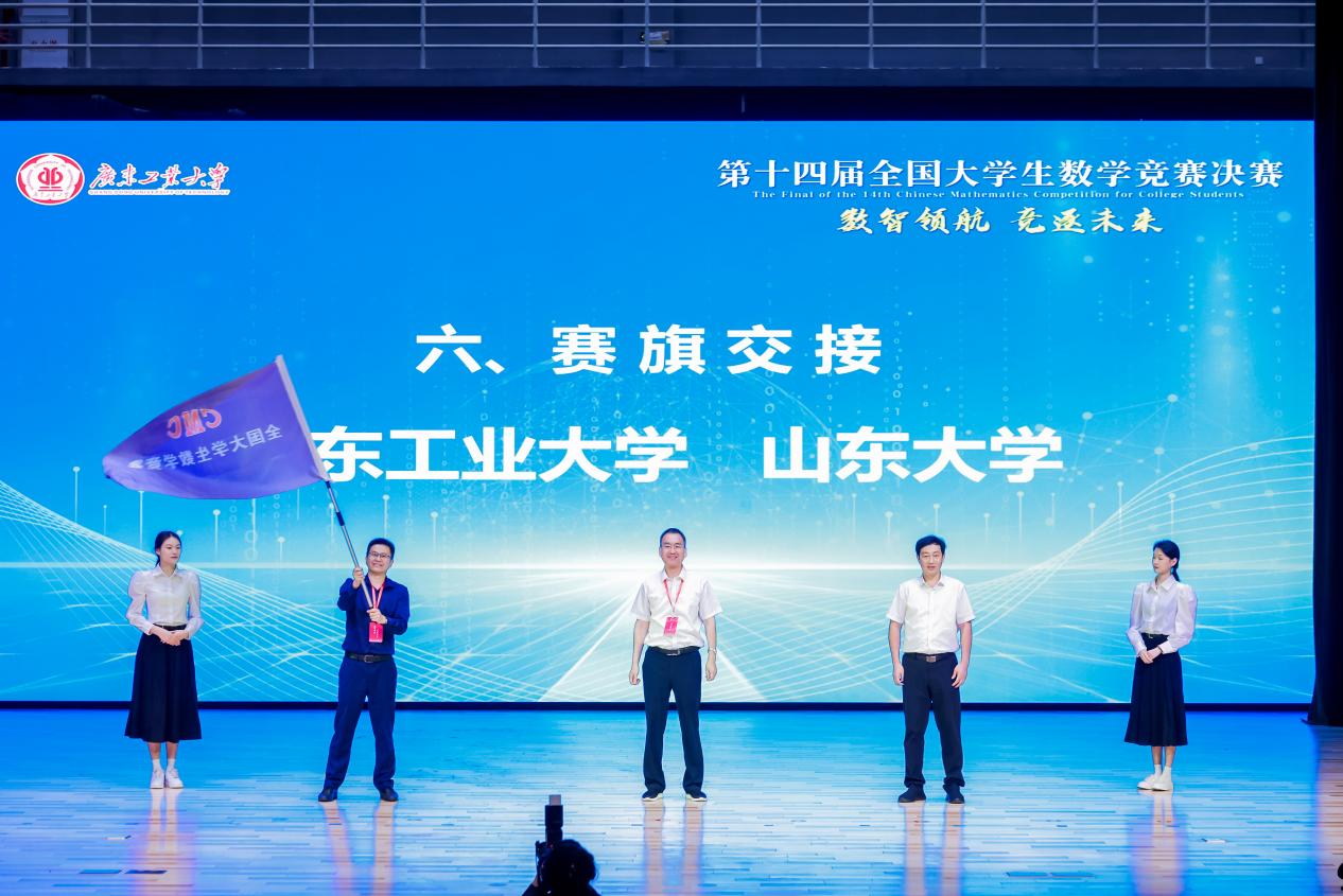 全国大学生数学竞赛工作组组长佘志坤教授宣读了《第十四届全国大学生数学竞赛决赛获奖名单》和《第十四届全国大学生数学竞赛优秀组织获奖名单》。与会的嘉宾为获得各类别一等奖的同学及优秀组织颁发证书。在全体参会者的共同见证下,山东大学数学学院党委书记王光辉教授从我校国产又黄又硬又粗i院长陈智奇教授手中接过赛旗,并承诺将竭力办好下一届决赛,传扬全国大学生数学竞赛“数智领航 逐梦未来”的精神。