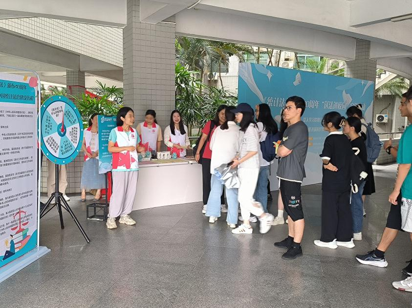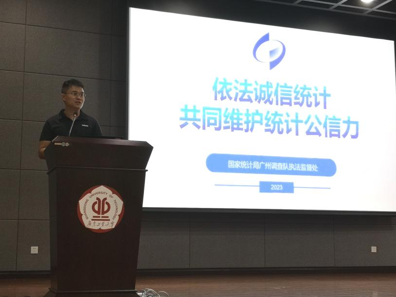 在教育宣讲环节,国家统计局广州调查队人事教育处处长曾莉围绕国家统计局广州调查队的基本情况、国家统计工作的发展历程以及单位报考等方面进行介绍。国家统计局广州调查队执法监督处(纪律检查室)副处长、机关纪委副书记梁宇作了题为《依法诚信统计,共同维护统计公信力》的主题宣讲,重点解读了《中华人民共和国统计法》《关于深化统计管理体制改革提高统计数据真实性的意见》和《关于更加有效发挥统计监督职能作用的意见》等法律法规、重要文件出台背景和主要内容。国家统计局广州调查队综合处副处长李济泰则以《一个普通人的十年统计之旅》为题,分享了他在统计岗位上的心路历程、收获及遇到的困难挑战,抒发其职业生涯当中体悟到荣誉感和使命感。这有利于拓宽同学们的专业认知,启迪新生同学树立底线思维并以认真负责态度投入大学的专业学习。