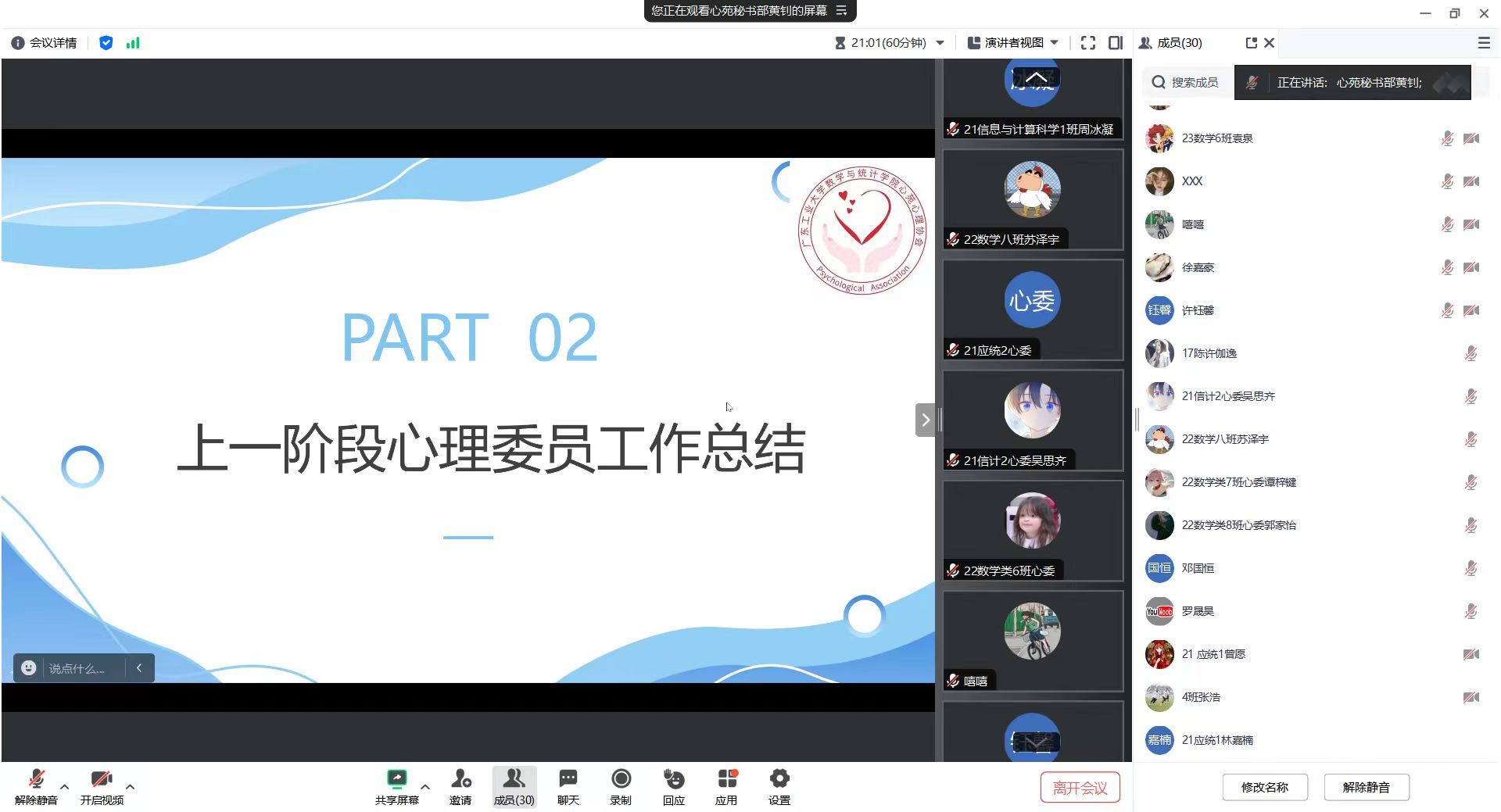 为进一步加强心理健康教育,充分发挥心理委员在心理健康工作中的重要纽带作用,2024年2月25日晚上8点,我院心苑心理协会召开了线上心理委员工作会议。学院党委林逢春副书记、心协指导老师黄植萍以及全院的心理委员参加了本次会议。