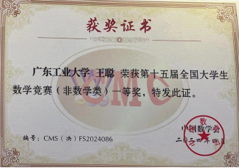 由中国数学会主办的第十五届全国大学生数学竞赛决赛于4月19日-21日在山东大学举行。我校共有6位同学通过激烈的初赛选拔进入决赛,最终全部获奖,斩获全国一等奖1项,全国三等奖5项。决赛共设置数学类高年级组、数学类低年级组和非数学类3个组别,王聪同学荣获非数学类一等奖,我校已连续三届获得了该项竞赛的一等奖。