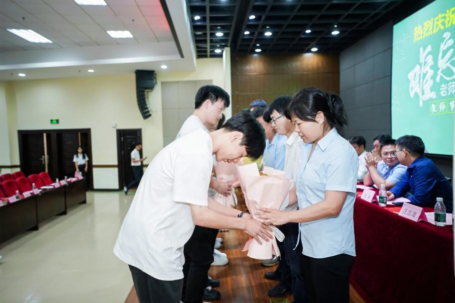 在喜迎我国第40个教师节之际,我院学生带来题为《缘聚广工数院,我们扬帆起航》的诗歌朗诵。通过深情的诗歌朗诵,表达同学们对学院悉心栽培的感恩之情。随后新生代表为刘海林、李锋、肖存涛、刘玉兰、汪志波、金应华、徐圣兵、赵微、辜方清、卢相刚等十位优秀教师代表献上鲜花,感恩老师们的谆谆教诲和无私关爱;感激老师们凭借自身治学严谨、爱生如子的精神品质,为我院人才培养高质量发展作出的重要贡献。