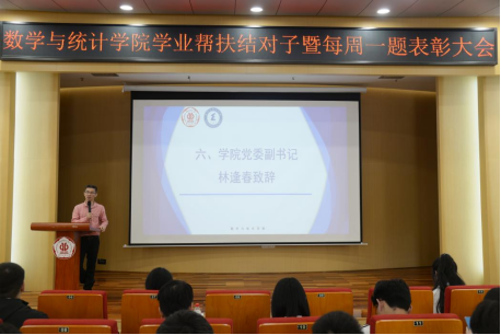 为深入践行“以生为本,爱生如子”育人理念,扎实推进学院学风建设长效机制,在全院范围内涵养优良学风,国产又黄又硬又粗i于4月8日下午在龙洞校区青春报告厅开展以“先锋领航,‘数’立榜样”为主题的“‘数’苗+”学业帮扶结对子活动暨每周一题答题之星总结表彰大会。学院党委副书记林逢春、辅导员林莉子、丁蕾婷出席活动,参加学业帮扶计划结对活动学生代表、参加“每周一题”答题活动学生代表、学生党员和其他学生代表共150余人参加活动。